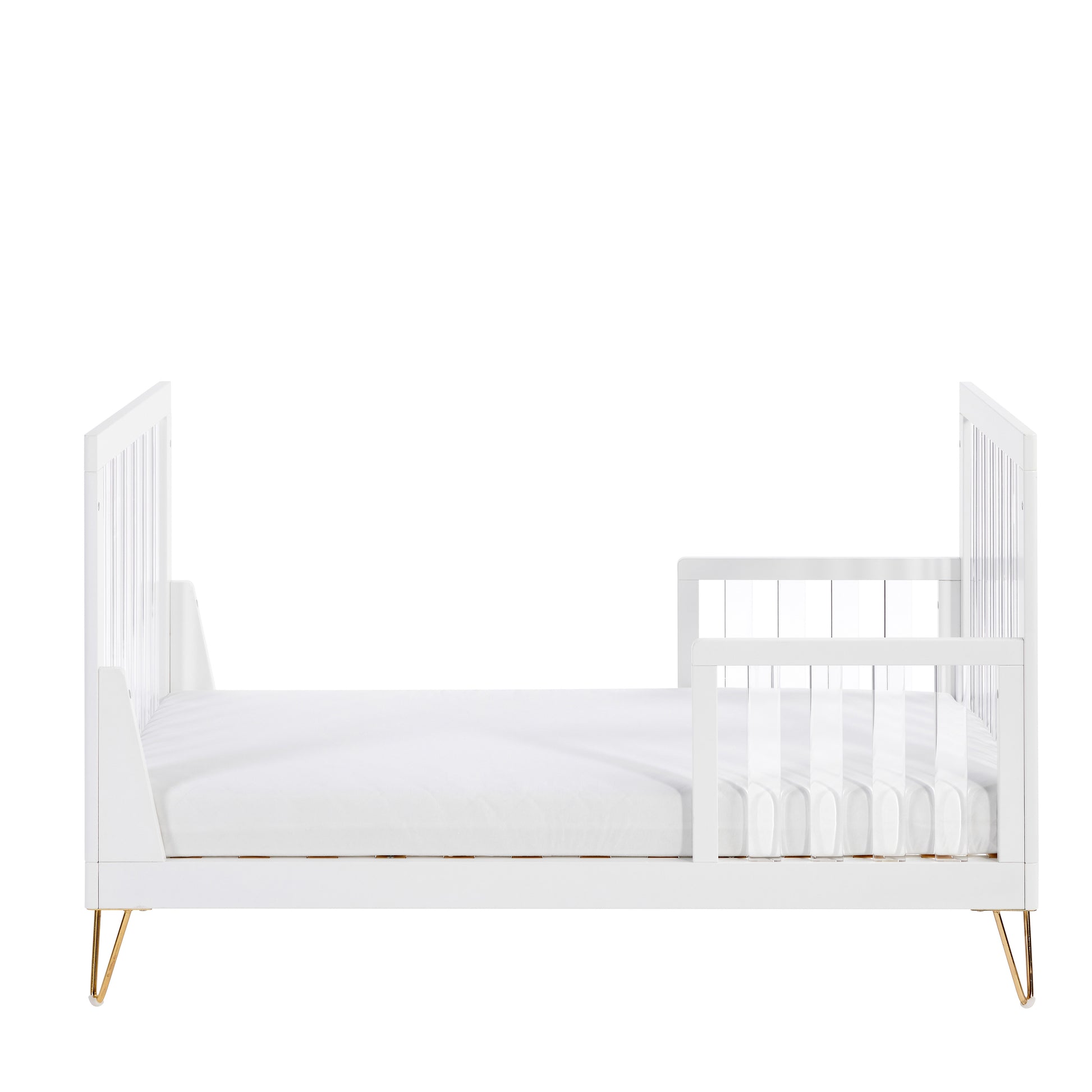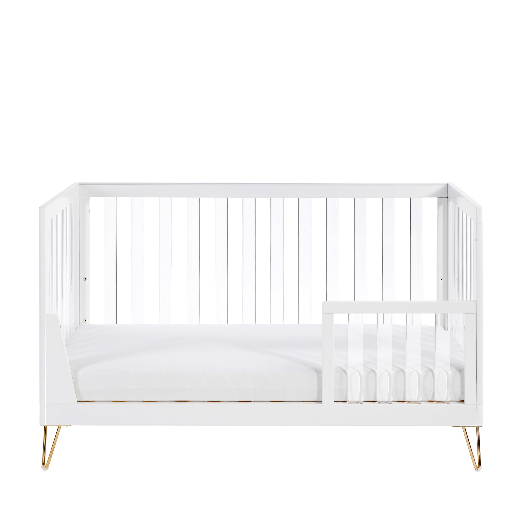 The Babymore Kimi XL convertible cot bed is the larger version of the Kimi cot bed, requiring a 140 x 70cm mattress (available separately). An exquisite combination of contemporary wooden style, modern acrylic slats and retro hairpin legs all blend seamlessly to provide a striking fashion statement. The 100% recyclable, non-toxic acrylic provides an airy, open feel that allows full visibility of your little one from any angle. The Scandi-inspired cot bed has been stylishly designed with retro hairpin legs. It offers 3 adjustable mattress heights, teething rails, and can be transformed into a toddler or day bed, suitable from birth to 5 years old. Two toddler rails, also boasting an acrylic style, are included for added piece of mind once your little one has grown and is old enough to sleep without the full cot rails. The hairpin legs are made of high-quality steel, stable, sturdy and durable, and come with floor protectors included.